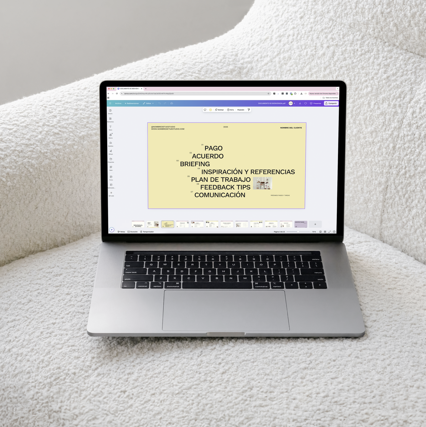- Incluye espacios para bienvenida, métodos de pago, acuerdos, inspiración, referencias, plan de trabajo y líneas de comunicación.